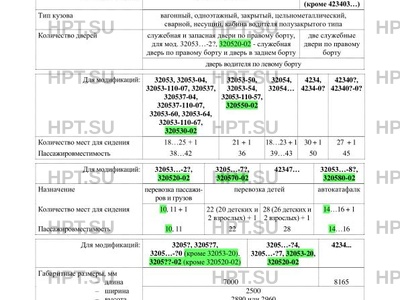 | Тип кузова/кол-во дверей | вагонный, одноэтажный, закрытый, цельнометаллический, сварной, несущий, кабина водителя полузакрытого типа Количество дверей служебная и запасная двери по правому борту, для мод. 32053…-2?, 320520-02 - служебная дверь по правому борту и дверь в заднем борту две служебные двери по правому борту дверь водителя по левому борту |