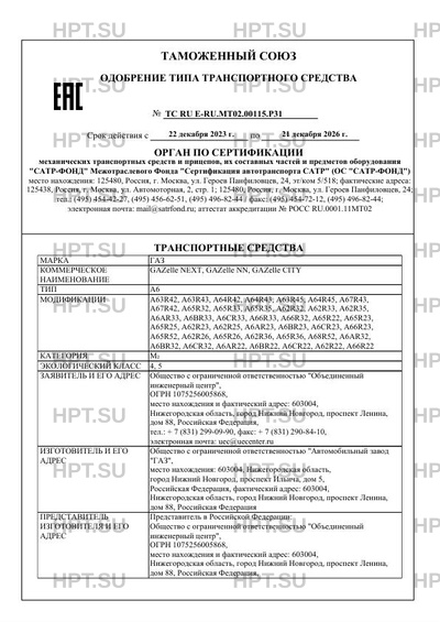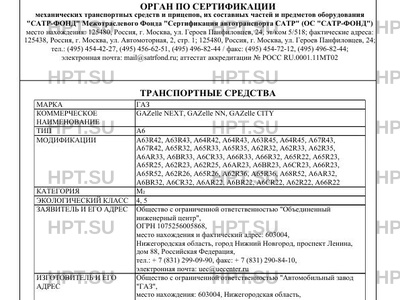 | Предприятие-изготовитель | Общество с ограниченной ответственностью "Автомобильный завод "ГАЗ", место нахождения: 603004, Нижегородская область, город Нижний Новгород, проспект Ильича, дом 5, Российская Федерация, фактический адрес: 603004, Нижегородская область, город Нижний Новгород, проспект Ленина, дом 88, Российская Федерация |