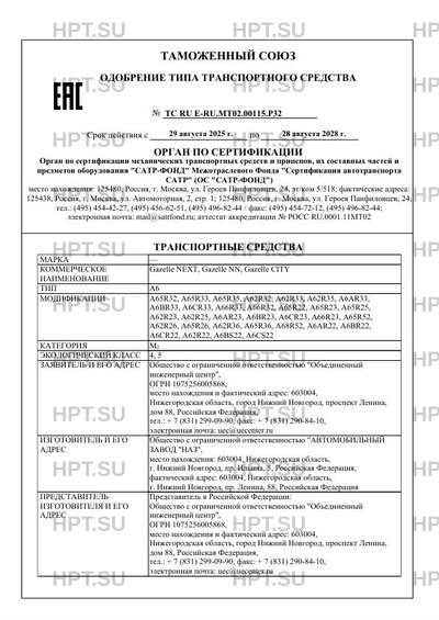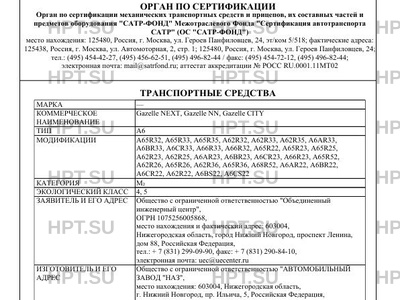 Оборудование ТС устройство ограничения максимальной скорости (функцию устройства ограничения максимальной скорости выполняет электронный блок управления двигателем) (для А66R??); служебная дверь с механическим приводом (для А68R52); светосигнальная громкоговорящая установка, передние противотуманные фары, совмещенная система вентиляции, отопления и кондиционирования (система управления климатом) с ручным управлением, предпусковой подогреватель, независимый отопитель, фильтровентиляционная установка, медицинское оборудование, 1 или 2-е носилок (для автомобилей скорой медицинской помощи); дневные ходовые огни, устройство вызова экстренных оперативных служб с ручным включением и автоматическим срабатыванием при опрокидывании по заказу: подушка безопасности водителя или подушка безопасности водителя и подушка безопасности передних пассажиров (кроме А68R52); фильтро-вентиляционная установка (для А68R52); специальный предупреждающий огонь автожелтого цвета (для А66R??); автономный отопитель (для А65R22, А65R32, А65R52, А62R32, А66R32, А68R52, А62R22, A66R22); устройство ограничения максимальной скорости (функцию устройства ограничения максимальной скорости выполняет электронный блок управления двигателем) (для А6?R33, А62R32, А65R32); аппарель (для А68R52); механическая подножка служебной двери (кроме А68R52); электронное противоугонное устройство (для мод. с коммерческим наименованием Gazelle NN); система "START/STOP" (для мод. с коммерческим наименованием Gazelle NN); детермальные стекла салона и передних дверей; догреватель охлаждающей жидкости; предпусковой подогреватель; передние противотуманные фары; зеркала с электроподогревом, электроприводом; сиденье водителя "люкс"; магнитола; электрические стеклоподъемники; круиз-контроль; аккумуляторная батарея повышенной емкости; блокировка дифференциала заднего моста; спутниковая система навигации ГЛОНАСС; тахограф; совмещенная система вентиляции, отопления и кондиционирования (система управления климатом) с ручным управлением; медиапанель, бортовой навигационно-связной терминал навигации, системы: диспетчеризации, видеофиксации (или видеонаблюдения), информирования пассажиров, оплаты проезда, мониторинга пассажиропотока, пожаротушения (для А68R52)
