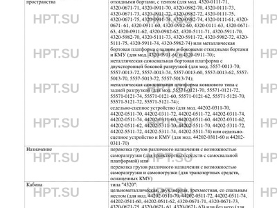 | Исполнение загрузочного пространства | металлическая бортовая платформа с задним и боковыми откидными бортами, с тентом (для мод. 4320-0111-71, 4320-0671-71, 4320-0911-70, 4320-0982-70, 4320-0111-73, 4320-0671-73, 4320-0911-72, 4320-0982-72, 4320-0111-75, 4320-0671-75, 4320-0911-74, 4320-0982-74, 4320-0111-61, 4320- 0671- 61, 4320-0911-60, 4320-0982-60, 4320-0111-63, 4320-0671- 63, 4320-0911-62, 4320-0982-62, 4320-5111-71, 4320-5911-70, 4320-5982-70, 4320-5111-73, 4320-5911-72, 4320-5982-72, 4320- 5111-75, 4320-5911-74, 4320-5982-74) или металлическая бортовая платформа с задним и боковыми откидными бортами и КМУ (для мод. 4320-0911-60 и 4320-0911-70); металлическая самосвальная бортовая платформа с двухсторонней боковой разгрузкой (для мод. 5557-0013-70, 5557-0013-72, 5557-0013-74, 5557-0013-60, 5557-0013-62, 5557- 5013-70, 5557-5013-72, 5557-5013-74); металлическая самосвальная платформа ковшового типа с задней разгрузкой (для мод. 55571-0121-70, 55571-0121-72, 55571-0121-74, 55571-0121-60, 55571-0121-62, 55571-5121-70, 55571-5121-72, 55571-5121-74); седельно-сцепное устройство (для мод. 44202-0311-70, 44202-0511-70, 44202-0311-72, 44202-0511-72, 44202-0311-74, 44202-0511-74, 44202-0311-60, 44202-0511-60, 44202-0311-62, 44202-0511-62, 44202-5311-70, 44202-5511-70, 44202-5311-72, 44202-5511-72, 44202-5311-74, 44202-5511-74) или седельносцепное устройство и КМУ (для мод. 44202-0311-60 и 44202- 0311-70) |