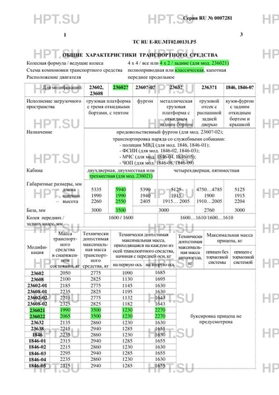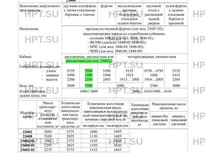 | Оборудование ТС | для мод. 1846, 1846-01, 1846-04, 1846-05: противотуманные фары, специальный предупреждающий огонь с наружным громкоговорящим устройством или сиреной, отсек для служебных собак с освещением, остеклением и вентиляцией; для мод. 1846-02, 1846-03, 1846-08, 1846-09: противотуманные фары, отсек для служебных собак с освещением, остеклением и вентиляцией; для мод. 1846, 1846-02, 1846-04, 1846-08 - по заказу: кондиционер, испарительный кондиционер отсека для служебных собак, поворотная фара, предпусковой подогреватель, система электронного контроля устойчивости, климат-контроль, штыревая антенна, подушки безопасности водителя и переднего пассажира, ограничитель скорости, круиз-контроль, другое оборудование, устанавливаемое по требованию заказчика; для мод. 1846-01, 1846-03, 1846-05, 1846-09 - по заказу: кондиционер, испарительный кондиционер отсека для служебных собак, поворотная фара, предпусковой подогреватель, штыревая антенна, подушки безопасности водителя и переднего пассажира, другое оборудование, устанавливаемое по требованию заказчика; для мод. 2360… - по заказу: кондиционер, предпусковой подогреватель, штыревая антенна, подушка безопасности водителя, другое оборудование, устанавливаемое по требованию заказчика; для мод. 23638 - по заказу: кондиционер, предпусковой подогреватель, штыревая антенна, подушки безопасности водителя и переднего пассажира, другое оборудование, устанавливаемое по требованию заказчика; для мод. 236381 - по заказу: кондиционер, предпусковой подогреватель, багажные дуги, сигнализация аварийного сближения при парковке, штыревая антенна, подушки безопасности водителя и переднего пассажира, другое оборудование, устанавливаемое по требованию заказчика; для мод. 23632 -по заказу: кондиционер, предпусковой подогреватель, система электронного контроля устойчивости, климат-контроль, штыревая антенна, подушки безопасности водителя и переднего пассажира, ограничитель скорости, круиз-контроль, другое оборудование, устанавливаемое по требованию заказчика; для мод. 236321 - по заказу: кондиционер, предпусковой подогреватель, система электронного контроля устойчивости, багажные дуги, сигнализация аварийного сближения при парковке, климатконтроль, штыревая антенна, подушки безопасности водителя и переднего пассажира, ограничитель скорости, круиз-контроль, другое оборудование, устанавливаемое по требованию заказчика. |