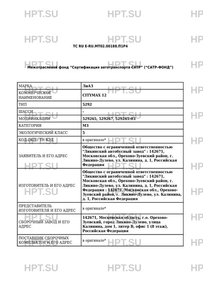 | Орган по сертификации | Орган по сертификации механических транспортных средств и прицепов, их составных частей и предметов оборудования "САTР-ФОНД" Межотраслевого Фонда "Сертификация автотранспорта САТР" (ОС "САТР-ФОНД") |