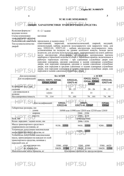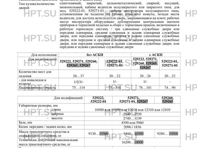 | Дополнительная информация | Транспортные средства категории М3 относятся к классу I. К экологическому классу 4 относятся транспортные средства с двигателями ЯМЗ-536111-40, ЯМЗ-536111-41. К экологическому классу 5 относятся транспортные средства с двигателями MAN E0836LOH01, D0836LOH65, D0836LOH64, ЯМЗ-53663, ЯМЗ-53633, ЯМЗ-53624-40. Автобусы мод. 529222-01, 529271-01 могут быть использованы для обучения и стажировки водителей |