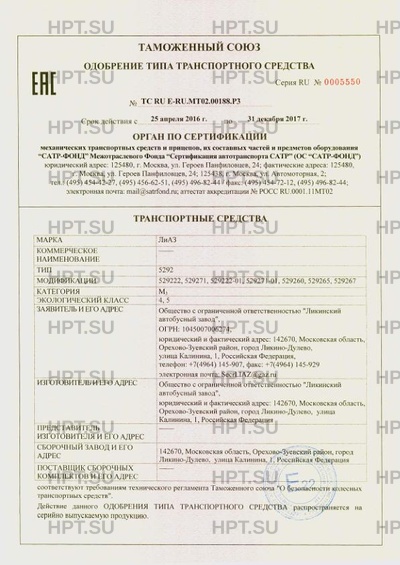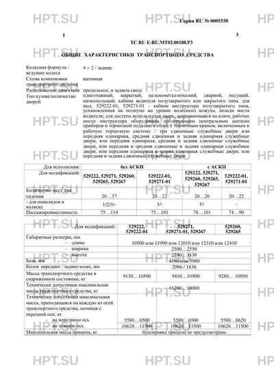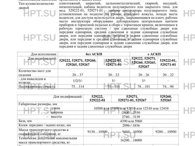 | Дополнительная информация | Транспортные средства категории М3 относятся к классу I. К экологическому классу 4 относятся транспортные средства с двигателями ЯМЗ-536111-40, ЯМЗ-536111-41. К экологическому классу 5 относятся транспортные средства с двигателями MAN E0836LOH01, D0836LOH65, D0836LOH64, ЯМЗ-53663, ЯМЗ-53633, ЯМЗ-53624-40. Автобусы мод. 529222-01, 529271-01 могут быть использованы для обучения и стажировки водителей. |
