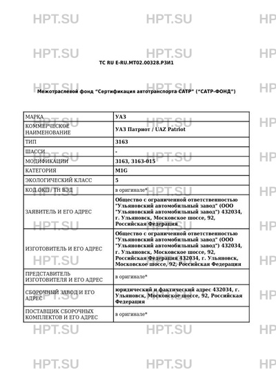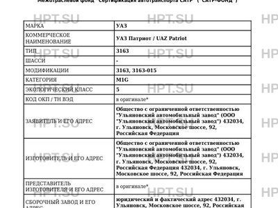 | Коммерческое наименование | УАЗ Патриот / UAZ Patriot |
