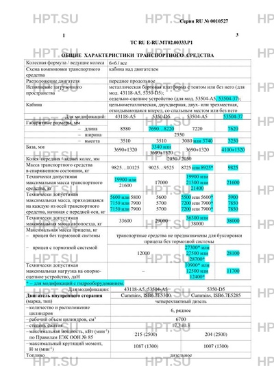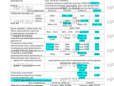 | Дополнительная информация | Транспортные средства не предназначены для перевозки опасных грузов. Таблица перевода буквенно-цифрового обозначения модификации транспортного средства в вариант для формализованного (цифрового) кода продукции в процессе производства и отгрузки в соответствии с системой SAP (System Analysis and Program Development), применяемой изготовителем транспортных средств: Обозначение модификации Вариант обозначения для формализованного (цифрового) кода 43118-А5 43118-48 5350-D5 5350-66 53504-A5 53504-48 |