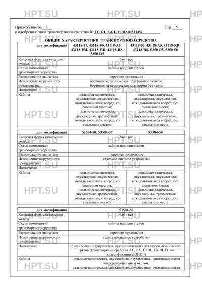 | Дополнительная информация | Транспортные средства модификаций 43118-A5, 43118-50, 43118-RR, 43118-RS, 43118-37, 5350-D5, 5350-50, 53504-37 не предназначены для перевозки опасных грузов. На сборочном заводе Акционерного общества «РЕМДИЗЕЛЬ» осуществляется сборка только транспортных средств КАМАЗ типа 43118 модификации 43118-50, 53504-50. На сборочном заводе Открытого акционерного общества «РИАТ» осуществляется сборка только транспортных средств КАМАЗ типа 43118 модификации 43118-RR, 43118-RS. Перевод буквенно-цифрового обозначения модификации транспортного средства в вариант для формализованного (цифрового) кода продукции в процессе производства и отгрузки в соответствии с системой SAP (System Analysis and Program Development), применяемой изготовителем транспортных средств: 43118-A5 — 43118-48 5350-D5 — 5350-66 43118-RR — 43118-76 43118-RS — 43118-80 Снаряженная масса транспортных средств модификации 53504-50 без оборудования для гидропривода — 9225 кг, с оборудованием для гидропривода — 9625 кг. Транспортные средства модификации 53504-50, соответствующие требованиям п. 2.5 Приложения № 6 к ТР ТС 018/2011, предназначены для буксирования полуприцепов, перевозящих опасные грузы (транспортные средства AT, OX, EX/II, EX/III, FL по классификации ДОПОГ). Технически допустимая максимальная масса автопоезда для транспортных средств модификации 53504-50, предназначенных для буксировки полуприцепов, перевозящих опасные грузы — 36000 кг. Тип Модификации Категория 43118 43118-37, 43118-50, 43118-A5, 43118-PM, 43118-RR, 43118-RS N3G 5350 5350-D5, 5350-50 N3G 53504 53504-50, 53504-37 N3 |