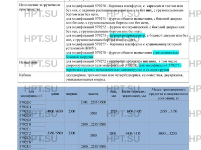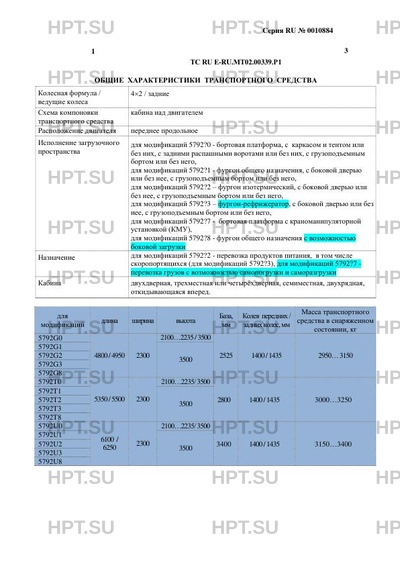 | Оборудование ТС | электронная система контроля устойчивости, для модификаций 5792?3 – холодильная установка, электрические стеклоподъемники, по заказу: устройство вызова экстренных оперативных служб, коробка отбора мощности, тахограф, предпусковой подогреватель, кондиционер, для модификаций 5792?0, 5792?1, 5792?2, 5792?3- грузоподъемный борт |