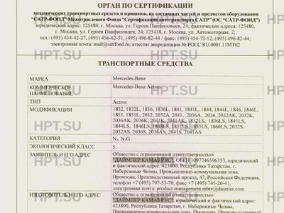 | Заявитель | Общество с ограниченной ответственностью «ДАЙМЛЕР КАМАЗ РУС». 423800, Республика Татарстан, г. Набережные Челны, Промышленно-коммунальная зона, Промзона, Производственный проезд, д. 47, Российская Федерация. ОГРН: 1097746596353. Тел. +7 (495) 797-53-70. Факс +7 (495) 745-26-41. Email product.management.mbtv@daimler.com. |