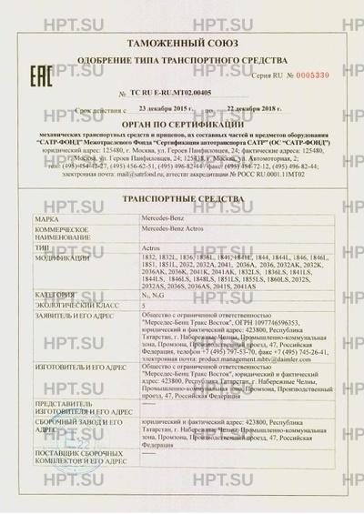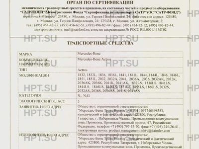 Предприятие-изготовитель Общество с ограниченной ответственностью Мерседес-Бенц Тракс Восток , юридический и фактический адрес: 423800, Республика Татарстан, г. Набережные Челны, Промышленно-коммунальная зона, Промзона, Производственный проезд, 47, Российская Федерация