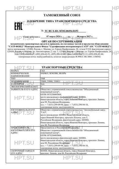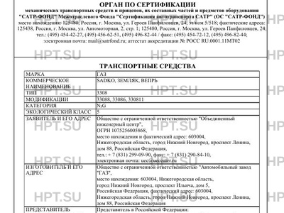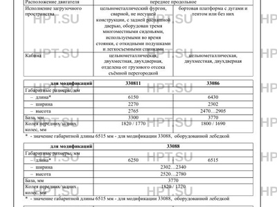 | Оборудование ТС | для мод.330811: лебедка, багажник на крыше, предпусковой подогреватель; для мод. 33088, 330811: система регулирования давления воздуха в шинах; для всех модификаций: устройство вызова экстренных оперативных служб с ручным включением и автоматическим срабатыванием при опрокидывании по заказу: для мод.33088: лебедка, второй топливный бак; для мод.330811: защита оперения, фара-искатель; для мод.33088, 33086: предпусковой подогреватель; для мод.33088, 33086: продольные боковые откидные сиденья (скамьи), используемые только во время стоянки; для мод.33088, 33086: продольные боковые откидные и съемные средние сиденья (скамьи), используемые только во время стоянки; для всех модификаций: тахограф, коробка отбора мощности |