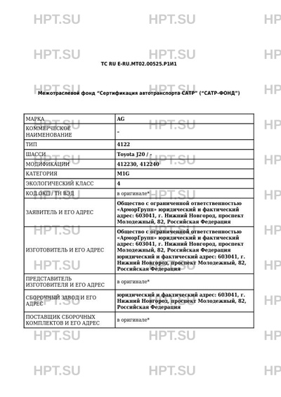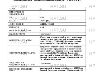 | Дополнительная информация | Транспортные средства 412230, 412240 изготовлены на базе Toyota Land Cruiser 200 мод. URJ202L- GNTEKW, URJ202L-GMTEKW, URJ202L-GNTVKW. Транспортные средства не предназначены для коммерческих перевозок пассажиров. |