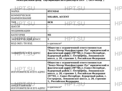 | Заявитель | Общество с ограниченной ответственностью "Хендэ Мотор Мануфактуринг Рус". юридический и фактический адрес: 197701, г. Санкт-Петербург, Курортный район, г. Сестрорецк, Левашовское шоссе, д. 20, строение 1, Российская Федерация. ОГРН: 1089847107514. Тел. +7 (812) 418-01-00. Факс +7 (812) 418-01-01. Email reception@hyundai-motor.ru. |