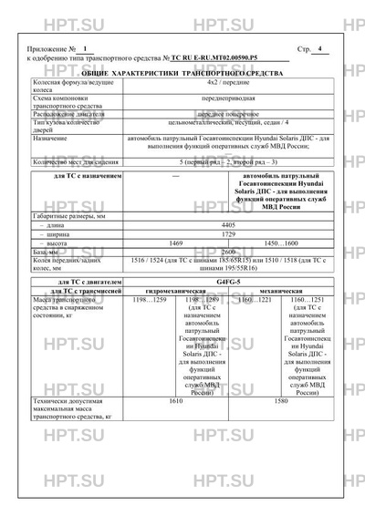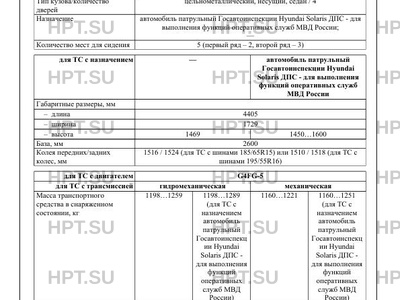 | Оборудование ТС | для автомобилей патрульных Госавтоинспекции Hyundai Solaris ДПС: аппаратно-программный комплекс видеонаблюдения, сигнально-громкоговорящая установка, дополнительная аккумуляторная батарея, устройство развязки аккумуляторных батарей, защита картера, защитная сетка радиатора, цветографическая схема согласно ГОСТ Р 50574-2019; для всех вариантов исполнения: электронная система контроля устойчивости (ESC); подушки безопасности; система вызова экстренных оперативных служб; система мониторинга давления воздуха в шинах, передние противотуманные фары по заказу: электрообогреватель наружных зеркал заднего вида; электрические стеклоподъемники; совмещенная система вентиляции, отопления и кондиционирования (система управления климатом) с автоматическим или ручным управлением (хладагент R134a); регулируемое устройство ограничения максимальной скорости; задние брызговики; отключаемая подушка безопасности переднего пассажира |