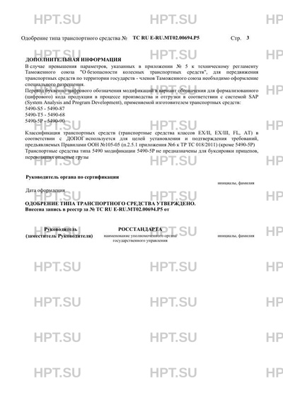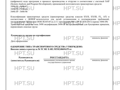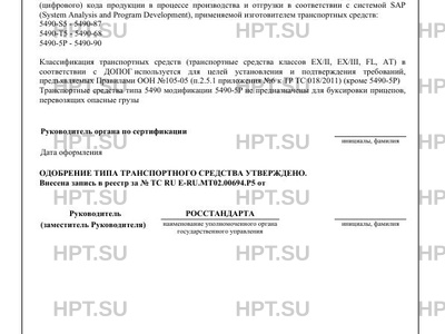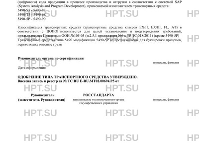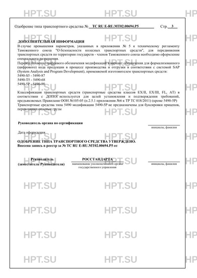 | Тип ТС | В случае превышения параметров, указанных в приложении № 5 к техническому регламенту Таможенного союза "О безопасности колесных транспортных средств", для передвижения транспортных средств по территории государств - членов Таможенного союза необходимо оформление специального разрешения. Перевод буквенно-цифрового обозначения модификаций в вариант обозначения для формализованного (цифрового) кода продукции в процессе производства и отгрузки в соответствии с системой SAP (System Analysis and Program Development), применяемой изготовителем транспортных средств: 5490-S5 - 5490-87 5490-T5 - 5490-68 5490-5P - 5490-90 Классификация транспортных средств (транспортные средства классов EX/II, EX/III, FL, AT) в соответствии с ДОПОГ используется для целей установления и подтверждения требований, предъявляемых Правилами ООН №105-05 (п.2.5.1 приложения №6 к ТР ТС 018/2011) (кроме 5490-5P) Транспортные средства типа 5490 модификации 5490-5Р не предназначены для буксировки прицепов, перевозящих опасные грузы |
