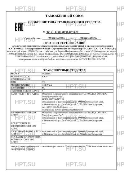 | Заявитель | Общество с ограниченной ответственностью «МАЗДА СОЛЛЕРС Мануфэкчуринг Рус». 690001, Приморский край, город Владивосток, улица Дальзаводская, 2, Российская Федерация. ОГРН: 1117746345958. Тел. (423) 2513-711. Факс (423) 2513-711. Email amorozova@mazdaeur.com. |