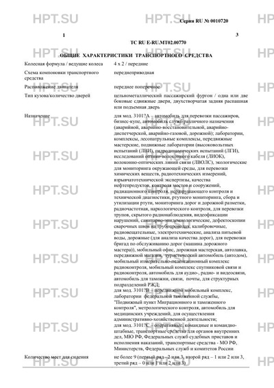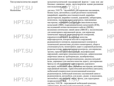 | Назначение | для мод. 3101?А - автомобиль для перевозки пассажиров, бизнес-купе, автомобиль служб различного назначения (аварийной, аварийно-восстановительной, аварийнодиспетчерской, аварийно-газовой, дорожной); лаборатории, комплексы, лесопатрульные комплексы, передвижные мастерские, подвижные лаборатории (высоковольтных испытаний (ЛВИ), гидродинамических испытаний (ЛГИ), исследований оптико-волоконного кабеля (ЛИОК), волоконно-оптических линий связи (ЛВОЛС), экологические для мониторинга окружающей среды, для перевозки химических веществ, радиотехнических измерений, взрывчатотехнической экспертизы, качества нефтепродуктов, контроля мостов и сооружений, радиационного контроля, неразрушающего контроля и технической диагностики, ртутного мониторинга, сбора и утилизации ртути, мониторинга дорог и дорожной разметки, радиочастотная, наркологического контроля, для перевозки трупов, скрытого радионаблюдения, видеофиксации нарушений, санитарно-эпидемиологические, дефектоскопии сварочных швов на трубопроводах, калибровочные, радиовещательные, электротехнические, анализа питьевой воды, дорожные (для анализа качества дорог), для перевозки бригад по обслуживанию дорог (машина дорожного мастера)), мобильный офис, дорожная мастерская, автолавка, передвижной магазин, туристический автомобиль (автодом), мобильный измерительно-пеленгационный комплекс радиоконтроля, мобильный комплекс спутниковой связи и радиоконтроля, автомобиль для аудио-, радиои видеосвязи, автомобиль для таможни, связи, почты, для структурных подразделений РЖД; для мод. 3101?В - передвижной мобильный комплекс, лаборатории федеральной таможенной службы, "Подвижный пункт Миграционного и таможенного контроля", метрологического контроля, автомобиль для медицинских учреждений, для осуществления административно-хозяйственной деятельности; для мод. 3101?С - оперативные, командные и командноштабные, транспортные средства для органов внутренних дел, МЮ РФ, Федеральных служб судебных приставов и исполнения наказаний, транспортные средства - МО РФ, Министерств, Федеральных служб и комитетов России |