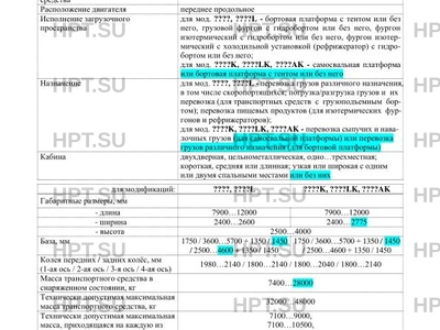 | Исполнение загрузочного пространства | для мод. ????, ????L - бортовая платформа с тентом или без него, грузовой фургон с гидробортом или без него, фургон изотермический с гидробортом или без него, фургон изотермический с холодильной установкой (рефрижератор) с гидробортом или без него; для мод. ????K, ????LK, ????AK - самосвальная платформа или бортовая платформа с тентом или без него |
