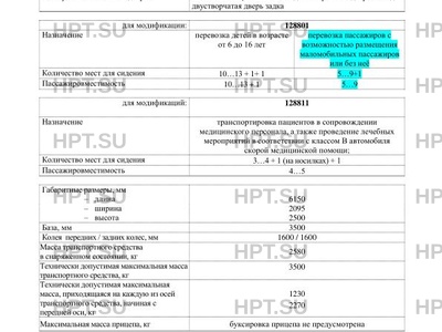 | Дополнительная информация | Транспортные средства не предназначены для коммерческих перевозок пассажиров. Транспортные средства модификации 128801 являются автобусами класса B и предназначены для перевозки только сидящих пассажиров (абзац пятый пункта 2.2 приложения № 1 к техническому регламенту Таможенного союза «О безопасности колесных транспортных средств»). Транспортные средства типа 1288 модификаций 128811 и 128801, имеющие менее 9 пассажирских сидений, относятся к транспортным средствам с уменьшенным числом посадочных мест. Транспортные средства типа 1288 модификации 128801 имеют назначения: автомобиль для перевозки детей в возрасте от 6 до 16 лет (код назначения «01»), пассажирское транспортное средство с возможностью перевозки маломобильных пассажиров или без неё (код назначения «02»). Транспортные средства типа 1288 модификации 128811 имеют назначение: автомобиль скорой медицинской помощи класса В (код назначения «11»). |