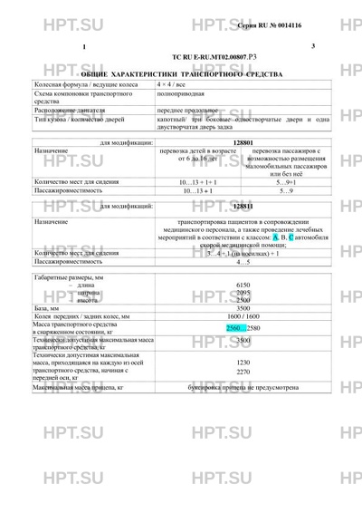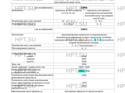 | Дополнительная информация | Транспортные средства не предназначены для коммерческих перевозок пассажиров. Транспортные средства модификации 128801являются автобусами классаB и предназначены для перевозки только сидящих пассажиров (абзац пятый пункта 2.2 приложения № 1 к техническому регламенту Таможенного союза «О безопасности колесных транспортных средств»). Транспортные средства типа 1288 модификаций128811 и 128801, имеющие менее 9 пассажирских сидений, относятся к транспортным средствам с уменьшенным числом посадочных мест. Транспортные средства типа 1288 модификации 128801 имеют назначения: автомобиль для перевозки детей в возрасте от 6 до 16 лет (код назначения «01»), пассажирское транспортное средство с возможностью перевозки маломобильных пассажиров или без неё (код назначения «02»). Транспортные средства типа 1288 модификации 128811 имеют назначение: автомобиль скорой медицинской помощи классаА или В или С (код назначения «11»). |