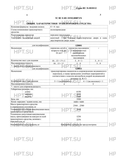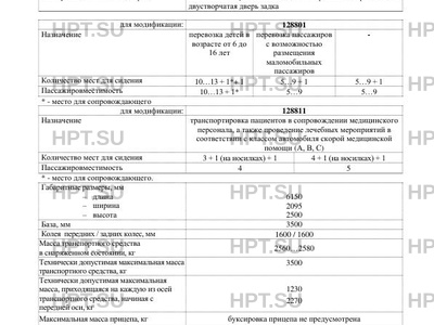 | Дополнительная информация | Транспортные средства не предназначены для коммерческих перевозок пассажиров. Транспортные средства модификации 128801 являются автобусами класса B и предназначены для перевозки только сидящих пассажиров (абзац пятый пункта 2.2 приложения № 1 к техническому регламенту Таможенного союза «О безопасности колесных транспортных средств»). Транспортные средства типа 1288 модификаций 128811 и 128801, имеющие менее 9 пассажирских сидений, относятся к транспортным средствам с уменьшенным числом посадочных мест. Транспортные средства типа 1288 модификации 128801 имеют назначения: автомобиль для перевозки детей в возрасте от 6 до 16 лет (код назначения «01»), пассажирское транспортное средство с возможностью перевозки маломобильных пассажиров или без неё (код назначения «02»). Транспортные средства типа 1288 модификации 128811 имеют назначение: автомобиль скорой медицинской помощи класса А или В или С (код назначения «11»). |