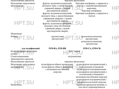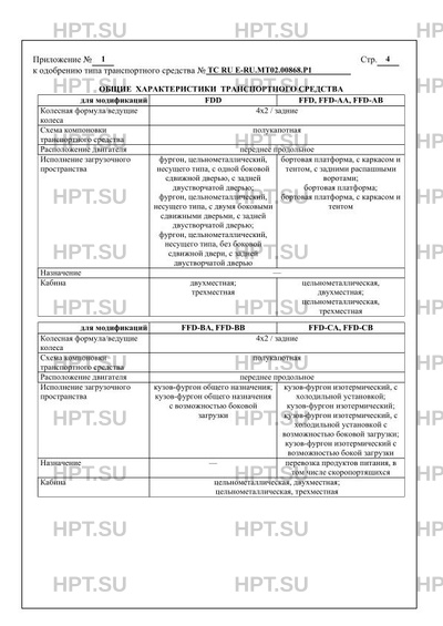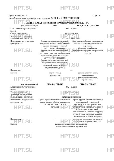 | Тип ТС | Транспортные средства не предназначены для перевозки опасных грузов. В обозначениях коммерческих наименований используются следующие цифровые и буквенные индексы: индексы 460 и 470 - означают технически допустимую максимальную массу транспортного средства 4600 кг и 4700 кг соответственно, индекс L - означает колесную базу 3750 мм для модификации FDD и 3954 мм для модификации FFD, индекс EL - означает колесную базу 4522 мм для модификации FFD, индекс EF - означает увеличенный задний свес транспортного средства. |