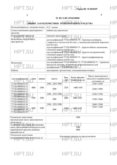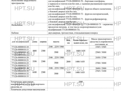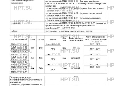 | Тип ТС | Модификации шасси HINO L5 используемые для изготовления транспортных средств: XZU600L-HKMGSW3 – для модификаций 77126-0000010-1?, XZU640L-HKMGSW3 – для модификаций 77126-0000010-2?, XZU650L-HKMGSW3 – для модификаций 77126-0000010-3?. Транспортные средства не предназначены для перевозки опасных грузов. |