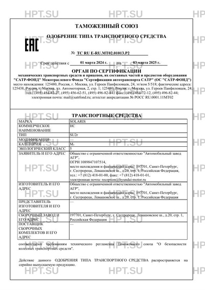 | Заявитель | Общество с ограниченной ответственностью "Автомобильный завод АГР", ОГРН 1089847107514, место нахождения и фактический адрес: 197701, Санкт-Петербург, г. Сестрорецк, Левашовское ш., д.20, стр. 1, Российская Федерация, тел.: +7 (812) 418-01-00, факс: +7 (812) 418-01-01, электронная почта: reception@hyundai-motor.ru |