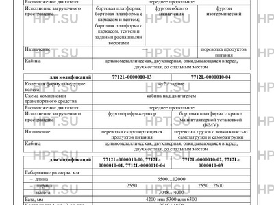 | Оборудование ТС | устройство вызова экстренных оперативных служб; холодильное оборудование (для 7712L-0000010-03); кондиционер по заказу: обтекатель на крыше кабины; грузоподъемный борт; тахограф; центральный замок; зеркала заднего вида с обогревом; аудиосистема; электрические стеклоподъемники; аппаратура спутниковой навигации; оборудование или подготовка для установки оборудования для контроля соблюдения водителем режимов движения, труда и отдыха; устройство ограничения максимальной скорости |