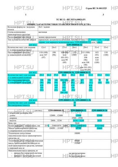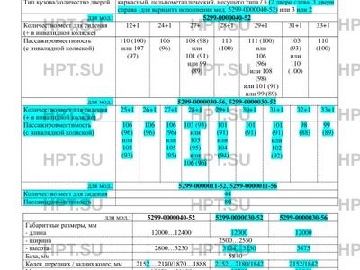 | Дополнительная информация | Транспортные средства модификации 5299-0000040-52, 5299-0000030-52, 5299-0000030-56 относятся к классу I, имеют выделенную площадь для стоящих пассажиров и обеспечивают быструю смену пассажиров (абзац пятый пункта 2.2 приложения № 1 к техническому регламенту Таможенного союза «О безопасности колесных транспортных средств»). Транспортные средства модификации 5299-0000011-52, 5299-0000011-56 относятся к классу II, предназначены для перевозки преимущественно сидящих пассажиров и имеющие возможность для перевозки стоящих пассажиров в проходе и (или) на площади, не превышающей площадь двойного пассажирского сидения (абзац пятый пункта 2.2 приложения № 1 к техническому регламенту Таможенного союза «О безопасности колесных транспортных средств»). При эксплуатации по дорогам общего пользования транспортных средств модификации 5299-0000040-52, которые могут быть использованы на территории аэропортов, не допускается использование дверей по левому борту. |