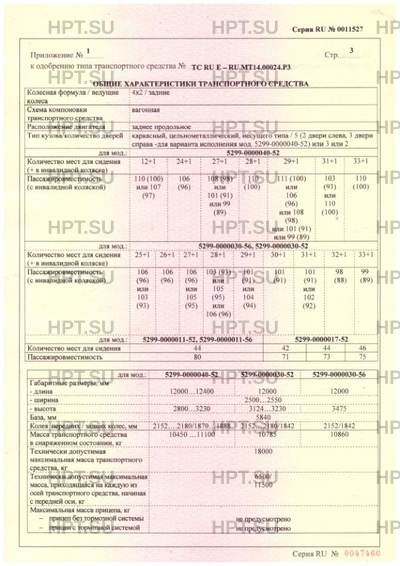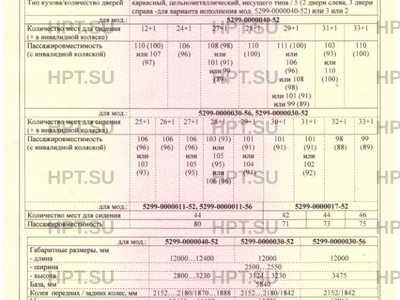 | Дополнительная информация | Транспортные средства модификации 5299-0000040-52, 5299-0000030-52, 5299-0000030-56 относятся к классу I, имеют выделенную площадь для стоящих пассажиров и обеспечивают быструю смену пассажиров (абзац пятый пункта 2.2 приложения № 1 к техническому регламенту Таможенного союза «О безопасности колесных транспортных средств»). Транспортные средства модификации 5299-0000011-52, 5299-0000011-56, 5299-0000017-52 относятся к классу II, предназначены для перевозки преимущественно сидящих пассажиров и имеющие возможность для перевозки стоящих пассажиров в проходе и (или) на площади, не превышающей площадь двойного пассажирского сидения (абзац пятый пункта 2.2 приложения № 1 к техническому регламенту Таможенного союза «О безопасности колесных транспортных средств»). При эксплуатации по дорогам общего пользования транспортных средств модификации 5299-0000040-52, которые могут быть использованы на территории аэропортов, не допускается использование дверей по левому борту. |