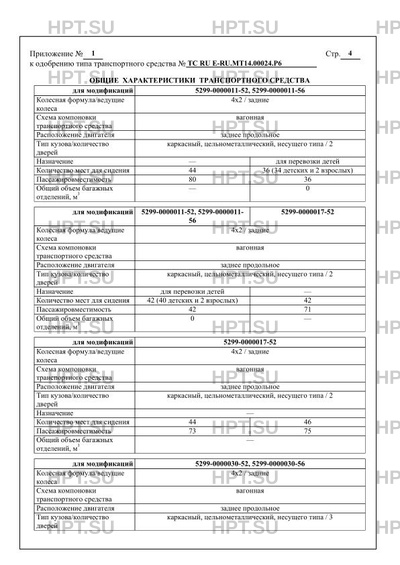 Дополнительная информация Транспортные средства модификаций 5299-0000040-52, 5299-0000030-52, 5299-0000030-56, 5299-0000030-57, 5299-0000040-57 относятся к классу I, имеют выделенную площадь для стоящих пассажиров и обеспечивают быструю смену пассажиров (абзац пятый пункта 2.2 приложения № 1 к техническому регламенту Таможенного союза «О безопасности колесных транспортных средств»). Транспортные средства модификаций 5299-0000011-52, 5299-0000011-56, 5299-0000017-52 относятся к классу II, предназначены для перевозки преимущественно сидящих пассажиров и имеющие возможность для перевозки стоящих пассажиров в проходе и (или) на площади, не превышающей площадь двойного пассажирского сидения (абзац пятый пункта 2.2 приложения № 1 к техническому регламенту Таможенного союза «О безопасности колесных транспортных средств»). Транспортные средства модификаций 5299-0000011-52, 5299-0000011-56 для перевозки детей относятся к классу III предназначены для перевозки исключительно сидящих пассажиров (абзац пятый пункта 2.2 приложения № 1 к техническому регламенту Таможенного союза «О безопасности колесных транспортных средств»). При эксплуатации по дорогам общего пользования транспортных средств модификации 5299-0000040-52, которые могут быть использованы на территории аэропортов, не допускается использования дверей по левому борту. При проведении испытаний двигателя WEICHAIWP7NG260E51 по методике Правил ООН № 85 максимальная величина P — измеренная мощность (испытательная мощность) составила 191,76 кВт при 2100 об.мин.