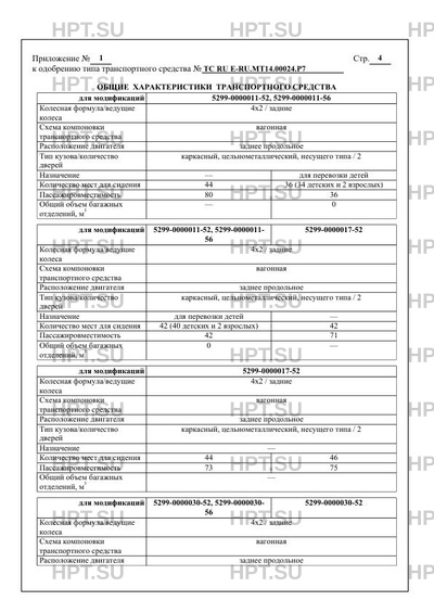 | Тип ТС | Транспортные средства модификаций 5299-0000040-52, 5299-0000030-52, 5299-0000030-56, 5299-0000030-57, 5299-0000040-57 относятся к классу I, имеют выделенную площадь для стоящих пассажиров и обеспечивают быструю смену пассажиров (абзац пятый пункта 2.2 приложения № 1 к техническому регламенту Таможенного союза «О безопасности колесных транспортных средств»). Транспортные средства модификаций 5299-0000011-52, 5299-0000011-56, 5299-0000017-52 относятся к классу II, предназначены для перевозки преимущественно сидящих пассажиров и имеющие возможность для перевозки стоящих пассажиров в проходе и (или) на площади, не превышающей площадь двойного пассажирского сидения (абзац пятый пункта 2.2 приложения № 1 к техническому регламенту Таможенного союза «О безопасности колесных транспортных средств»). Транспортные средства модификаций 5299-0000011-52, 5299-0000011-56 для перевозки детей относятся к классу III предназначены для перевозки исключительно сидящих пассажиров (абзац пятый пункта 2.2 приложения № 1 к техническому регламенту Таможенного союза «О безопасности колесных транспортных средств»). При эксплуатации по дорогам общего пользования транспортных средств модификации 5299-0000040-52, которые могут быть использованы на территории аэропортов, не допускается использования дверей по левому борту. При проведении испытаний двигателя WEICHAIWP7NG260E51 по методике Правил ООН № 85 максимальная величина P - измеренная мощность (испытательная мощность) составила 191,76 кВт при 2100 об.мин. ПрипроведениииспытанийдвигателяWEICHAIWP7NG290E51пометодикеПравилООН№85 максимальнаявеличина P-измереннаямощность (испытательнаямощность) составила213 кВтпри 2100об.мин. |