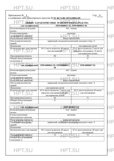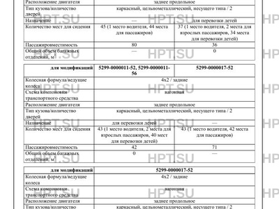 Тип ТС При эксплуатации по дорогам общего пользования транспортных средств модификации 5299-0000040-52, которые могут быть использованы на территории аэропортов, не допускается использования дверей по левому борту. При проведении испытаний двигателя WEICHAI WP7NG260E51 по методике Правил ООН № 85 максимальная величина P - измеренная мощность (испытательная мощность) составила 191,76 кВт при 2100 об/мин. При проведении испытаний двигателя WEICHAI WP7NG290E51 по методике Правил ООН № 85 максимальная величина P - измеренная мощность (испытательная мощность) составила 213 кВт при 2100 об/мин Транспортные средства относятся к классу I, имеют выделенную площадь для стоящих пассажиров и обеспечивают быструю смену пассажиров (абзац пятый пункта 2.2 приложения № 1 к техническому регламенту Таможенного союза «О безопасности колесных транспортных средств») Транспортные средства относятся к классу II, предназначены для перевозки преимущественно сидящих пассажиров и имеют возможность для перевозки стоящих пассажиров в проходе и на площади, не превышающей площадь двойного пассажирского сидения (абзац пятый пункта 2.2 приложения № 1 к техническому регламенту Таможенного союза «О безопасности колесных транспортных средств»)