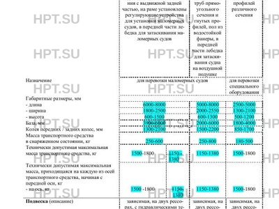 | Исполнение загрузочного пространства | рама сварная из стальных труб прямоугольного сечения с выдвижной задней частью, на раме установлены регулирующие устройства для установки маломерных судов, в передней части лебедка для затаскивания маломерных судов рама сварная из стальных профилей, на раме установлен фургон с задней и/или передней и/или боковой одноили двухстворчатой дверью или без них, с боковым или верхним открыванием или с откидной дверью-трапом кузов с несущей рамой, передний, задний борта и продольные борта откидывающиеся на петлях, пол из водостойкой фанеры |