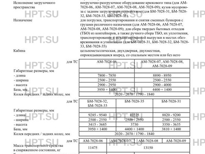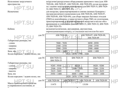 | Исполнение загрузочного пространства | погрузочно-разгрузочное оборудование крюкового типа (для АМ- 7028-06, АМ-7028-07, АМ-7028-08, АМ-7028-09); кузов мусоровоза с задним загрузочным устройством (для БМ-7028-31, БМ-7028- 32, БМ-7028-33, БМ-7028-35) |