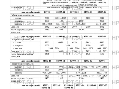 Исполнение загрузочного пространства платформа с открывающимися передним и задним бортами, может быть оборудована дугами и тентом, и надставными бортами, панели бортов металлические (крашенные или оцинкованные) или из фанеры, или из алюминиевой бортовой доски (82993,82993-01,82993 -02,82993-03,82993-07,82993-11,82993-12, 82993-13,82994); фургон общего назначения (82993-04,82993-05,82993-06,82993-10); платформа с ложементами (82993-08,82993-09)
