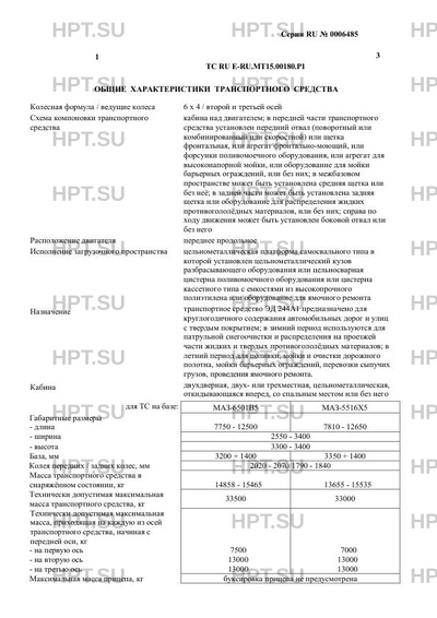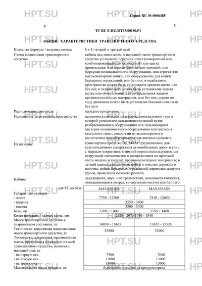 | Дополнительная информация | Модификации применяемых базовых транспортных средств: 6501В5, 5516Х5. К категории N3 относятся транспортные средства на базе транспортного средства: марка МАЗ, тип N33, модификация 6501В5; к категории N3G относятся транспортные средства на базе транспортного средства: марка МАЗ, тип N33, модификация 5516Х5. В связи с несоответствием параметров транспортных средств значениям, установленным в пунктах 1.1, 1.2, 2.1 и 2.2 приложения № 5 к техническому регламенту Таможенного союза «О безопасности колесных транспортных средств» ТР ТС 018/2011, для передвижения транспортных средств по территории государств – членов Таможенного союза необходимо оформление специального разрешения. |