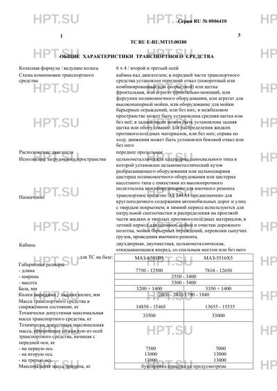 | Дополнительная информация | Модификации применяемых базовых транспортных средств: 6501В5, 5516Х5. К категории N3 относятся транспортные средства на базе транспортного средства: марка МАЗ, тип N33, модификация 6501В5; к категории N3G относятся транспортные средства на базе транспортного средства: марка МАЗ, тип N33, модификация 5516Х5. В связи с несоответствием параметров транспортных средств значениям, установленным в пунктах 1.1, 1.2, 2.1 и 2.2 приложения № 5 к техническому регламенту Таможенного союза «О безопасности колесных транспортных средств» ТР ТС 018/2011, для передвижения транспортных средств по территории государств – членов Таможенного союза необходимо оформление специального разрешения |