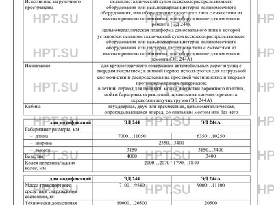 | Исполнение загрузочного пространства | цельнометаллический кузов пескосолераспределяющего оборудования или цельносварная цистерна поливомоечного оборудования, или оборудование кассетного типа с емкостями из высокопрочного полиэтилена, или оборудование для ямочного ремонта (ЭД 244); цельнометаллическая платформа самосвального типа в которой установлен цельнометаллический кузов пескосолераспределяющего оборудования или цельносварная цистерна поливомоечного оборудования или цистерна кассетного типа с емкостями из высокопрочного полиэтилена, или оборудование для ямочного ремонта (ЭД 244А) |