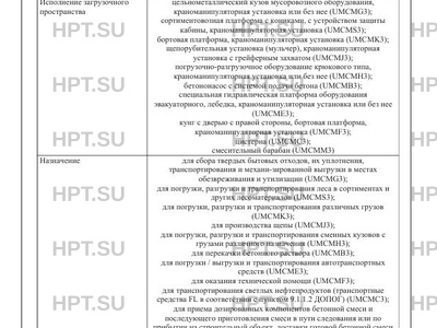 | Исполнение загрузочного пространства | цельнометаллический кузов мусоровозного оборудования, краноманипуляторная установка или без нее (UMCMG3); сортиментовозная платформа с кониками, с устройством защиты кабины, краноманипуляторная установка (UMCMS3); бортовая платформа, краноманипуляторная установка (UMCMK3); щепорубительная установка (мульчер), краноманипуляторная установка с грейферным захватом (UMCMJ3); погрузочно-разгрузочное оборудование крюкового типа, краноманипуляторная установка или без нее (UMCMH3); бетононасос с системой подачи бетона (UMCMB3); специальная гидравлическая платформа оборудования эвакуаторного, лебедка, краноманипуляторная установка или без нее (UMCME3); кунг с дверью с правой стороны, бортовая платформа, краноманипуляторная установка (UMCMF3); цистерна (UMCMC3); смесительный барабан (UMCMM3) , щ у я к о р U р , щ у я к о р U р |