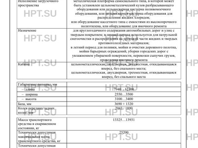| Исполнение загрузочного пространства | металлическая платформа самосвального типа, в которой может быть установлен цельнометаллический кузов разбрасывающего оборудования или цельносварная цистерна поливомоечного оборудования, или цельносварная цистерна оборудования для распределения жидких хлоридов; или оборудование кассетного типа с емкостями из высокопрочного полиэтилена, или оборудование для ямочного ремонта |