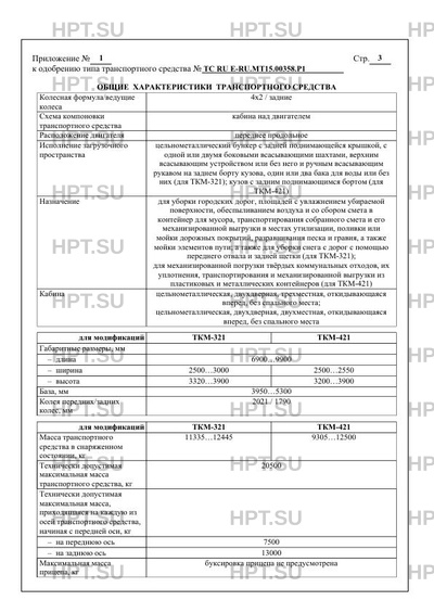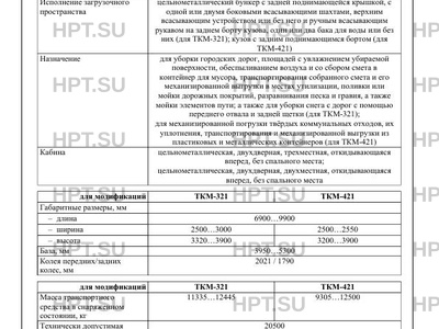 Исполнение загрузочного пространства цельнометаллический бункер с задней поднимающейся крышкой, с одной или двумя боковыми всасывающими шахтами, верхним всасывающим устройством или без него и ручным всасывающим рукавом на заднем борту кузова, один или два бака для воды или без них (для ТКМ-321); кузов с задним поднимающимся бортом (для ТКМ-421)