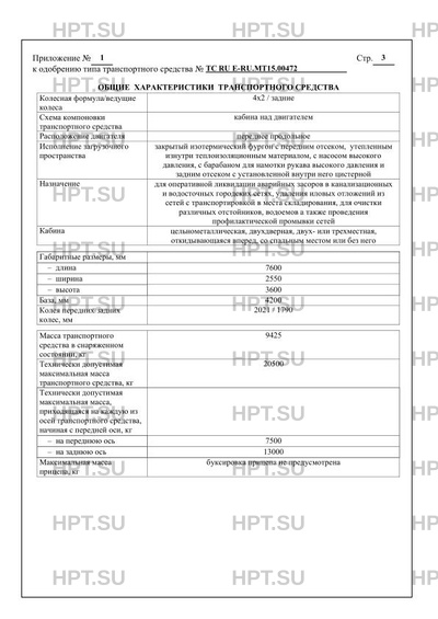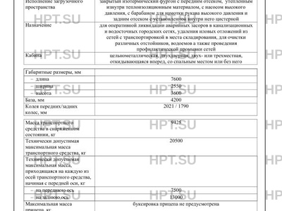 | Оборудование ТС | проблесковый маяк оранжевого цвета – 2 - 3 шт., фары освещения рабочих зон – 2 - 4 шт., технологическое оборудование для выполнения ремонтных, восстановительных и аварийных работ, насосы, рукава, устройство ограничения максимальной скорости (функцию устройства ограничения максимальной скорости выполняет электронный блок управления двигателем), дневные ходовые огни (для ТС, соответствующих требованиям Правил ООН № 48-04), устройство вызова экстренных оперативных служб с автоматическим срабатыванием при опрокидывании по заказу: предпусковой подогреватель двигателя, кондиционер (хладагент R 134A), дневные ходовые огни (для ТС, соответствующих требованиям Правил ООН № 48-03), передние противотуманные фары (кроме ТС, соответствующих требованиям Правил ООН № 48-04) |