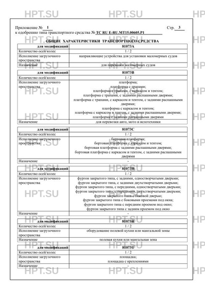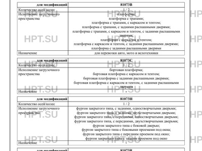 | Оборудование ТС | страховочный трос или цепь; опорное колесо или стойка по заказу: противооткатные упоры; домкрат; лебедка (для 81073А); трапы (для 81073В); каркас и тент (для 81073В, 81073С); пластиковый колпак (для 81073В, 81073С, 81073Н); задние распашные двери (для 81073В, 81073С, 81073Н); кондиционер и (или) холодильное оборудование (для 81073Н); встроенная мебель (для 81073Н); встроенное оборудование и техника (для 81073Н) боковая выносная подножка (для 81073Н); задняя выносная подножка (для 81073Н); передний грузовой отсек (ящик) (для 81073Н); подвижная (наклонная) платформа |