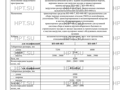 | Назначение | транспортные средства КО-440-7, КО-440-4К1 предназначены для сбора твердых коммунальных отходов (ТКО) из контейнеров, уплотнения ТКО, транспортирования и механизированной выгрузки в местах обезвреживания и утилизации; транспортное средство КО-440А1 предназначено для кузовной системы сбора и вывоза крупногабаритного бытового и строительного мусора от жилых массивов и строительных площадок к местам выгрузки, один мусоровоз может обслуживать несколько кузовов |