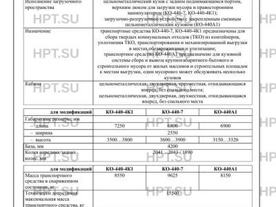 | Исполнение загрузочного пространства | цельнометаллический кузов с задним поднимающимся бортом, верхним люком для загрузки мусора и правосторонним манипулятором (КО-440-7, КО-440-4К1); загрузочно-разгрузочное устройство с закрепленным сменным цельнометаллическим кузовом (КО-440А1) |