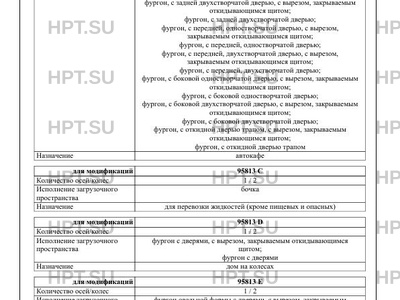 | Исполнение загрузочного пространства | фургон, с задней одностворчатой дверью, с вырезом, закрываемым откидывающимся щитом; фургон, с задней одностворчатой дверью; фургон, с задней двухстворчатой дверью, с вырезом, закрываемым откидывающимся щитом; фургон, с задней двухстворчатой дверью; фургон, с передней, одностворчатой дверью, с вырезом, закрываемым откидывающимся щитом; фургон, с передней, одностворчатой дверью; фургон, с передней, двухстворчатой дверью, с вырезом, закрываемым откидывающимся щитом; фургон, с передней, двухстворчатой дверью; фургон, с боковой одностворчатой дверью, с вырезом, закрываемым откидывающимся щитом; фургон, с боковой одностворчатой дверью; фургон, с боковой двухстворчатой дверью, с вырезом, закрываемым откидывающимся щитом; фургон, с боковой двухстворчатой дверью; фургон, с откидной дверью трапом, с вырезом, закрываемым откидывающимся щитом; фургон, с откидной дверью трапом бочка фургон с дверями, с вырезом, закрываемым откидывающимся щитом; фургон с дверями фургон овальной формы с дверями, с вырезом, закрываемым откидывающимся щитом; фургон овальной формы с дверями; фургон прямоугольной формы с дверями, с вырезом, закрываемым откидывающимся щитом; фургон прямоугольной формы с дверями оборудование для перевозки кабеля направляющие устройства для установки маломерных судов; ровный настил пола для перевозки маломерных судов на воздушной подушке оборудование полевой кухни платформа, с откидным задним бортом, с установленым складным модулем для размещения светодидных модулей и дорожных знаков, световозвращающей разметки; платформа, с откидным передним бортом, с установленым складным модулем для размещения светодидных модулей и дорожных знаков, световозвращающей разметки; платформа, с откидным задним и передним бортами, с установленым складным модулем для размещения светодидных модулей и дорожных знаков, световозвращающей разметки; платформа, с установленым складным модулем для размещения светодидных модулей и дорожных знаков, световозвращающей разметки фургон, пол из водостойкой фанеры, имеющий сбоку дверь и задний вырез, закрываемый откидывающимся щитом; фургон, пол из водостойкой фанеры, имеющий сбоку дверь и боковой вырез, закрываемый откидывающимся щитом; фургон, пол из водостойкой фанеры, имеющий спереди дверь и задний вырез, закрываемый откидывающимся щитом; фургон, пол из водостойкой фанеры, имеющий спереди дверь и боковой вырез, закрываемый откидывающимся щитом платформа, с каркасом, тентом, ворота в задней части; платформа, с каркасом, тентом, ворота в передней и задней части; платформа, с каркасом, тентом; платформа фургон, с распашными воротами бортовой с каркасом, тентом, с распашными воротами; бортовой с каркасом, тентом; бортовой платформа, с каркасом, тентом, с распашными воротами; платформа, с каркасом, тентом; платформа |