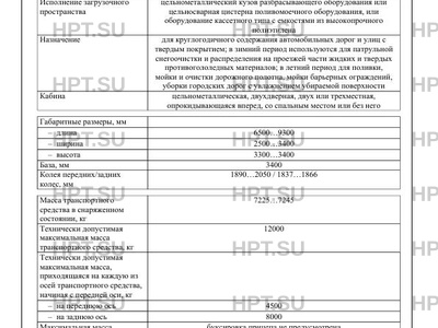 | Оборудование ТС | в передней части транспортного средства установлен передний отвал (поворотный или комбинированный) или щетка фронтальная, или агрегат фронтально-моющий, или форсунки поливомоечного оборудования, или агрегат для высоконапорной мойки, или оборудование для мойки барьерных ограждений, или без них; в межбазовом пространстве транспортного средства установлена средняя щетка или без неё; в задней части транспортного средства установлена задняя щетка или оборудование для распределения жидких противогололёдных материалов, или без них; проблесковый маяк оранжевого цвета - 1 - 4 шт. или световая панель - 1 - 2 шт., фара освещения рабочей зоны - 1- 2 шт., устройство вызова экстренных оперативных служб с автоматическим срабатыванием при опрокидывании; устройство ограничения максимальной скорости (ограничение максимальной скорости осуществляется электронной системой управления двигателем); по заказу: автономный отопитель кабины, предпусковой подогреватель двигателя, кондиционер (хладагент R134А), электроблокировка замков дверей, антенна, тахограф; аппаратура спутниковой навигации |