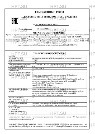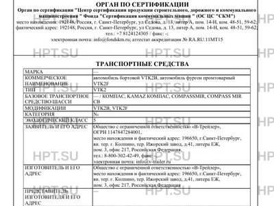 | Предприятие-изготовитель | Общество с ограниченной ответственностью "В-Трейлер", место нахождения и фактический адрес: 196650, г.Санкт-Петербург, вн. тер. г. Колпино, тер. Ижорский завод, д.41, литера ЕЖ, пом. 3, офис 217, Российская Федерация |
